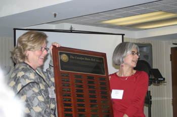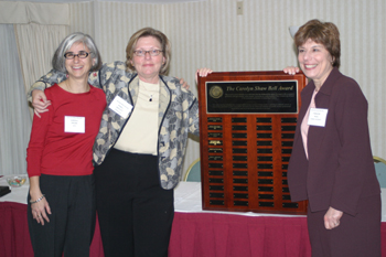 Caren Grown, Robin Bartlett and Fran Blau pose beside the Carol Bell Shaw award plaque.