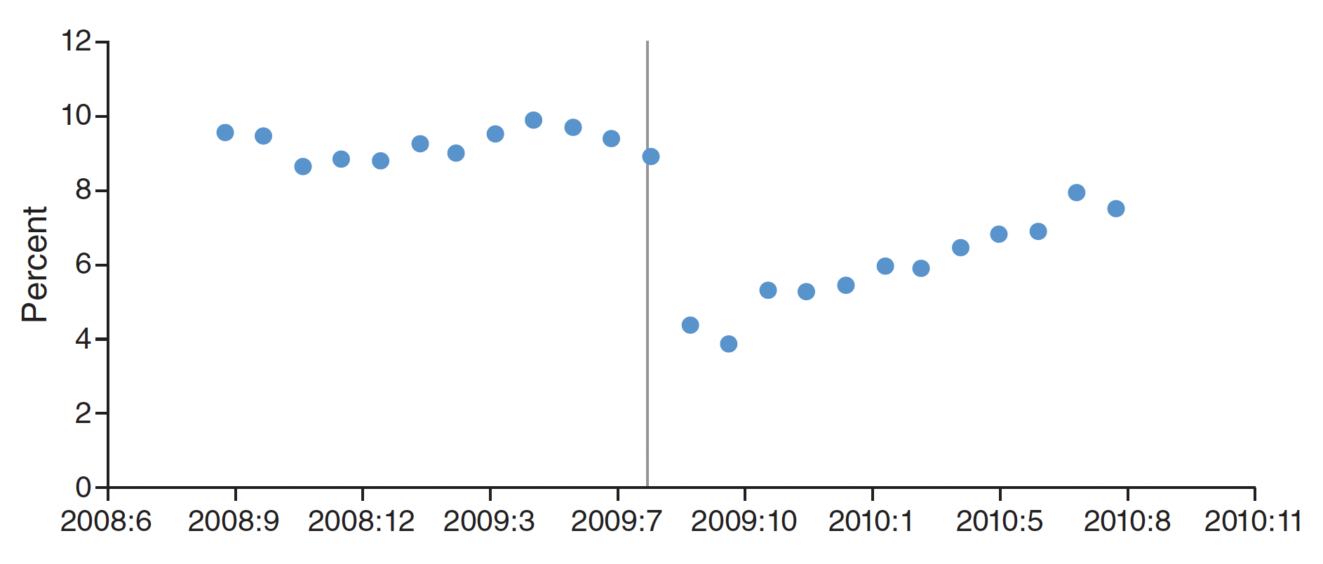 The chart below shows the average monthly share of badged sellers on eBay. The vertical line indicates when the stricter certification requirments for sellers was introduced.
