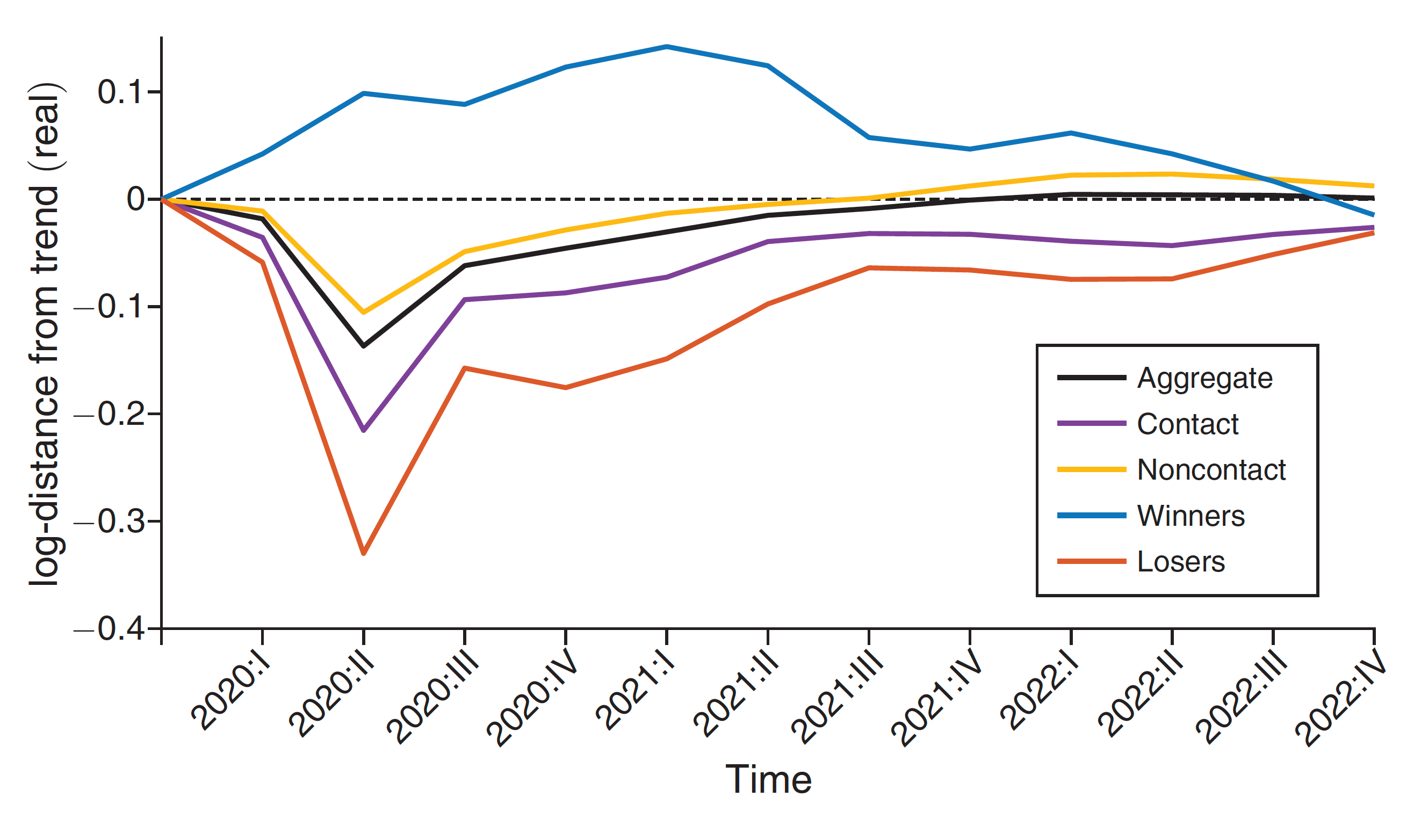 The detrended revenue of the pandemic losers within the contact sector—indicated by the red line—plummets to negative 33 percent in the second quarter of 2020. The losing firms included businesses like airlines, hotels, restaurants, and cruise lines, which require face-to-face interaction. Even by late 2022, losing firms remained significantly below their pre-pandemic trends.
