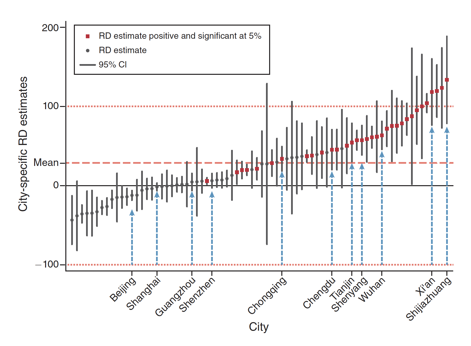 The researchers collected news reports to determine the exact dates that China’s automatic monitoring program was implemented in 123 cities, which included a total of 654 monitoring stations. Using a regression discontinuity design, they compared the reported levels of particulate matter (PM) in the air before and after the reforms.