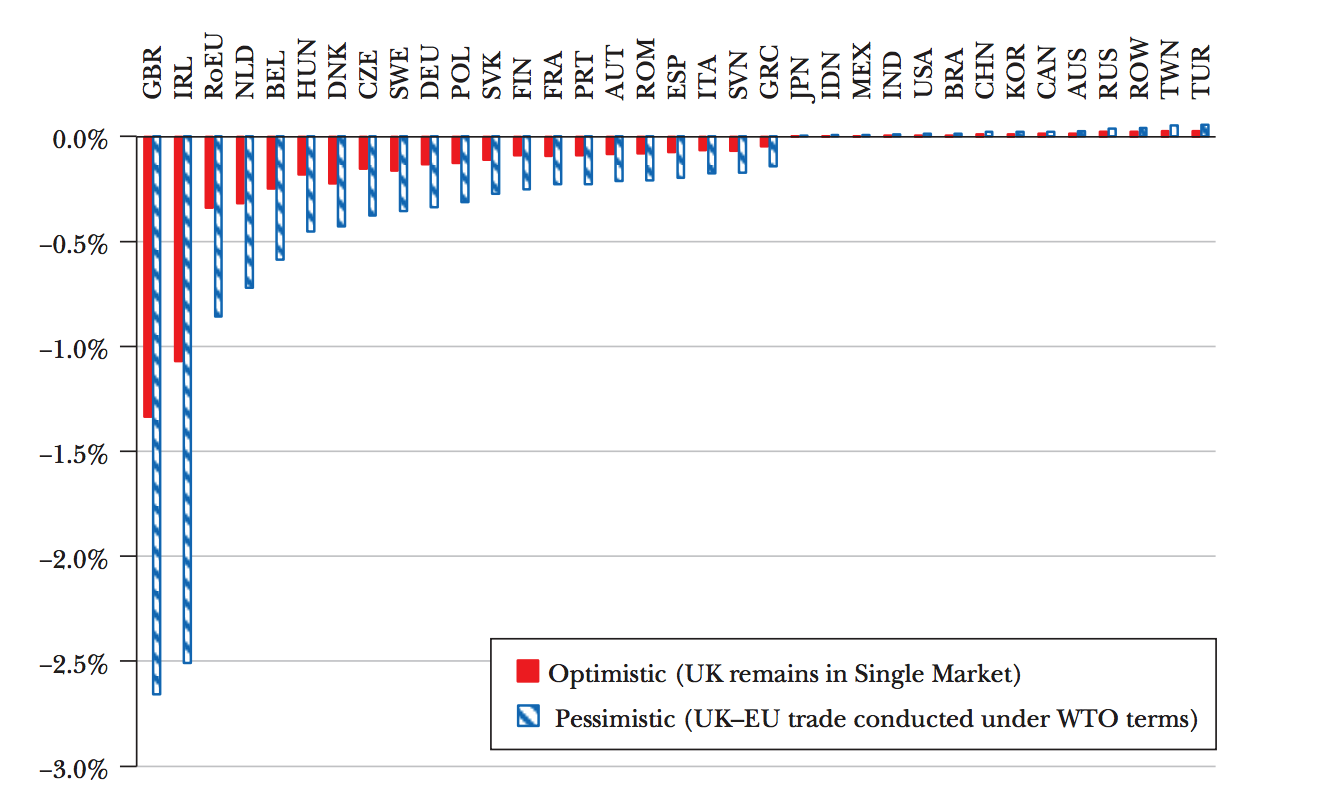 The UK will experience the most severe losses, but Brexit will harm other EU countries as well (see the figure below). Each bar represents the percentage change in income per capita that would have the same welfare effect as Brexit. The red bars represent the Single Market scenario, and the blue bars represent the WTO scenario.
