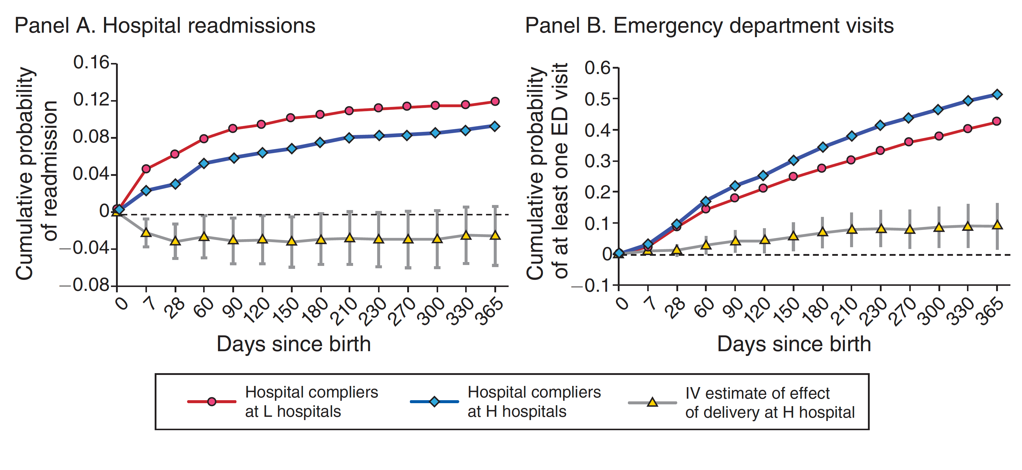 Panel B shows that the cumulative probabilities of an emergency department visit after birth exhibit a much different pattern. Initially, there is little difference between babies born in hospitals with high compared to low rates of C-sections. But a few months after birth, hospitals with high rates of C-sections see more emergency department visits, and that probability continues to rise throughout the first year of life. Most of these emergency department visits were for respiratory-related problems, which is consistent with a large number of observational studies linking C-sections to respiratory issues.