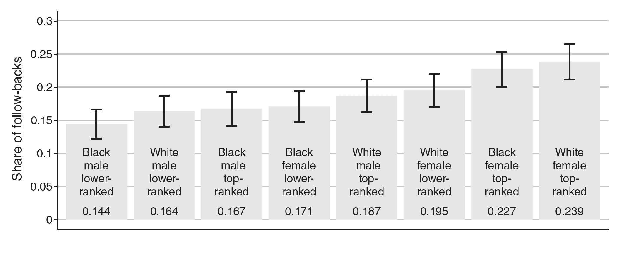 In general, the different follow-back rates suggest that economists on X are less willing to connect with Black PhD students or those from relatively lower-ranked institutions.