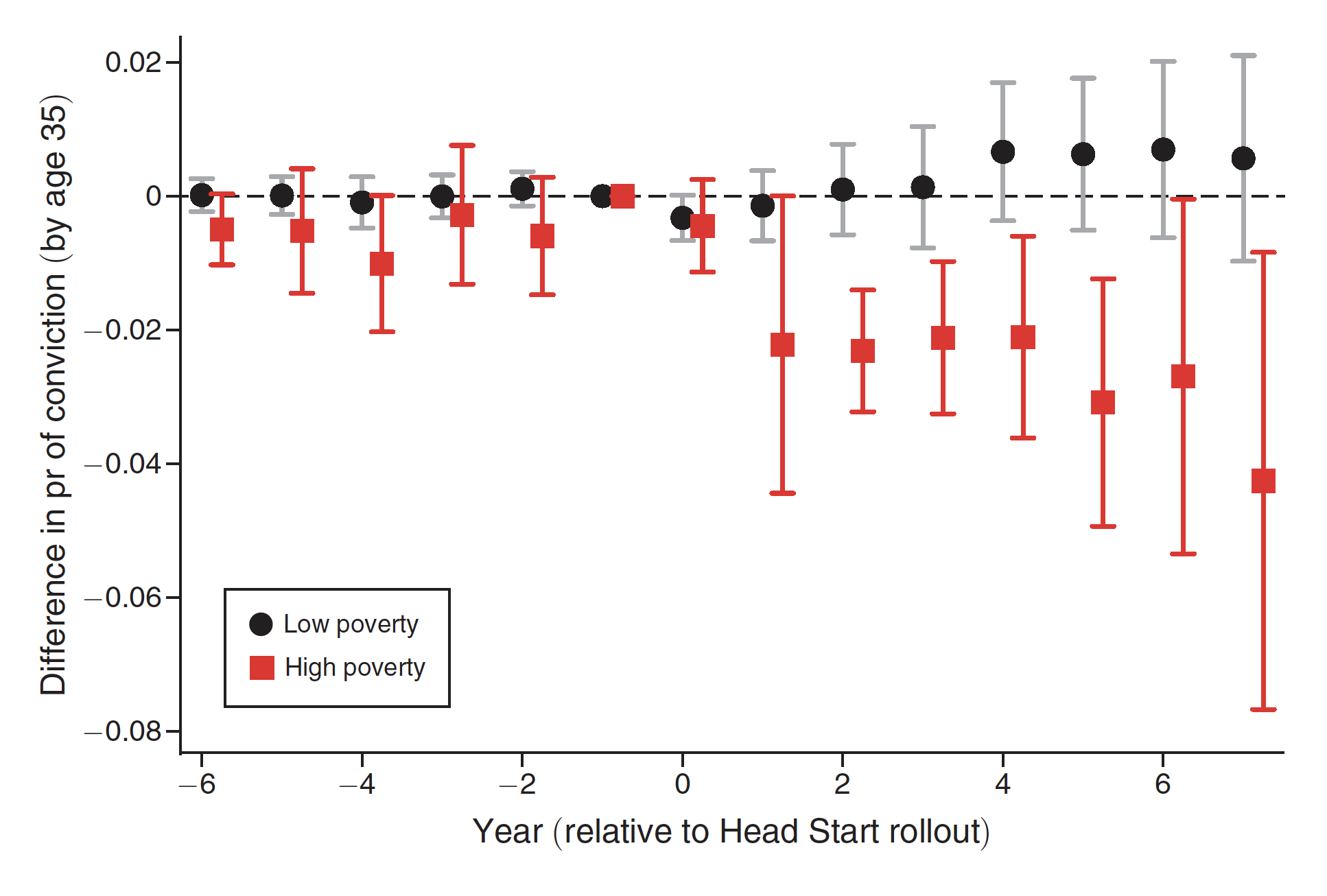 The y-axis shows the impact of Head Start on the probability of a serious conviction by age 35. The estimates come from comparing individuals born in counties and cohorts with varying levels of availability to Head Start. In North Carolina, Head Start was not available to 4-year-olds prior to 1965, but by 1968, eligible 4-year-olds in 55 North Carolina counties had access to Head Start. The x-axis indicates the year relative to Head Start’s rollout in North Carolina counties.