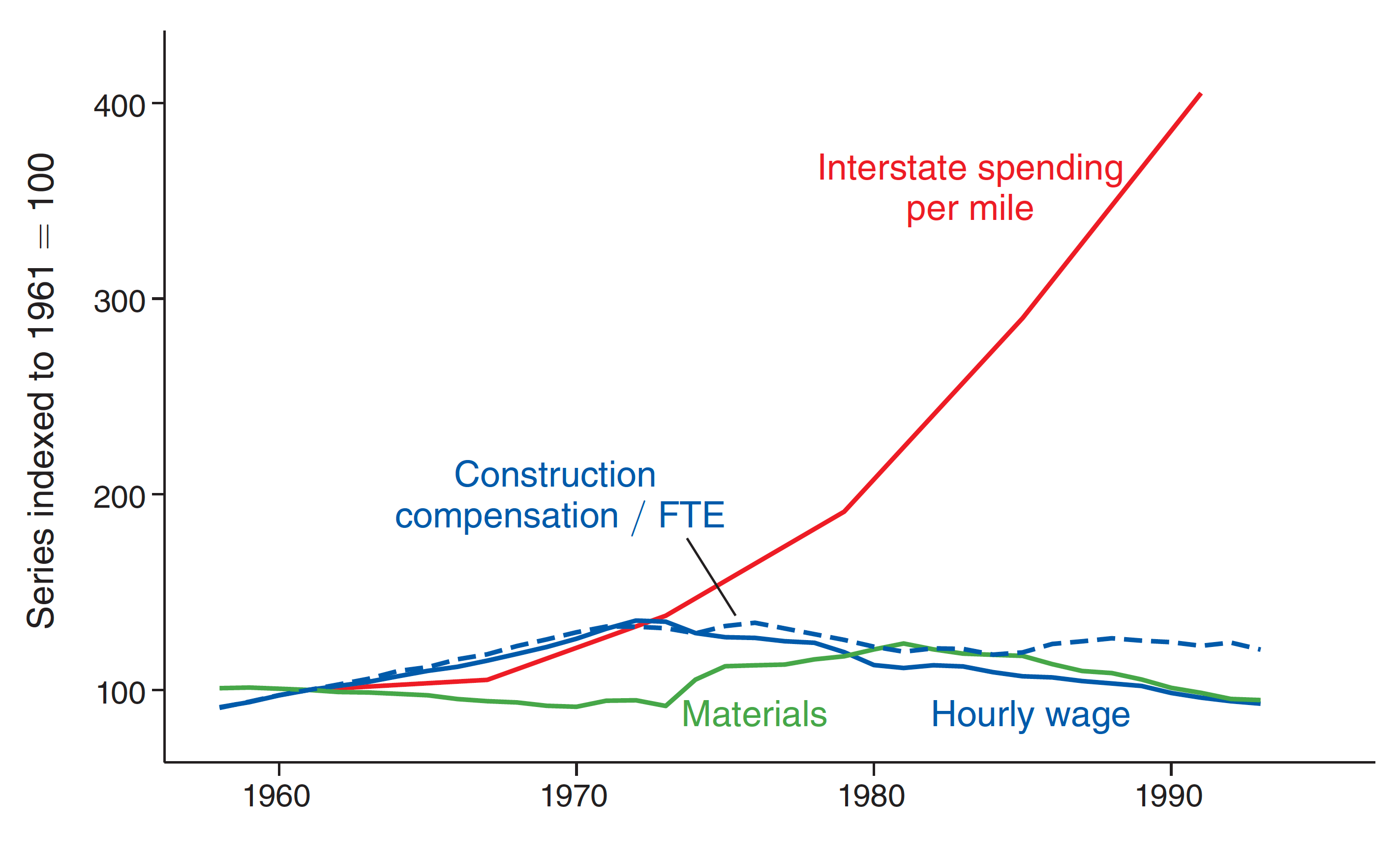 Instead, the cost increase was likely a result of rising incomes and greater input from citizens. As households’ resources increased, they were willing to pay more for highways with expensive features—such as noise walls, trenches, and overpasses—and pay more for building them in ways that were less disruptive to surrounding communities. At the same time, changes in legislation in the 1960s and 1970s gave US citizens more opportunities to voice their preferences and concerns.