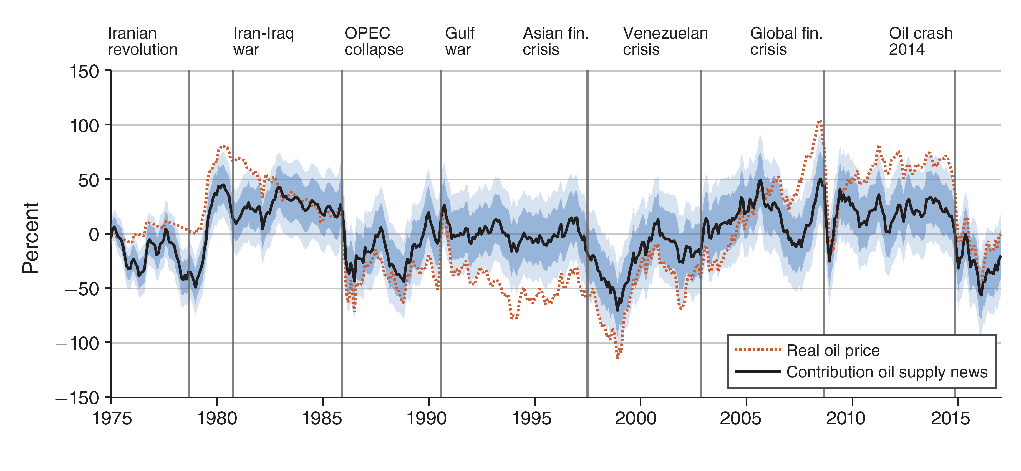Figure 5 from his paper shows the contribution of these news shocks to the price of oil from 1975 to 2017.