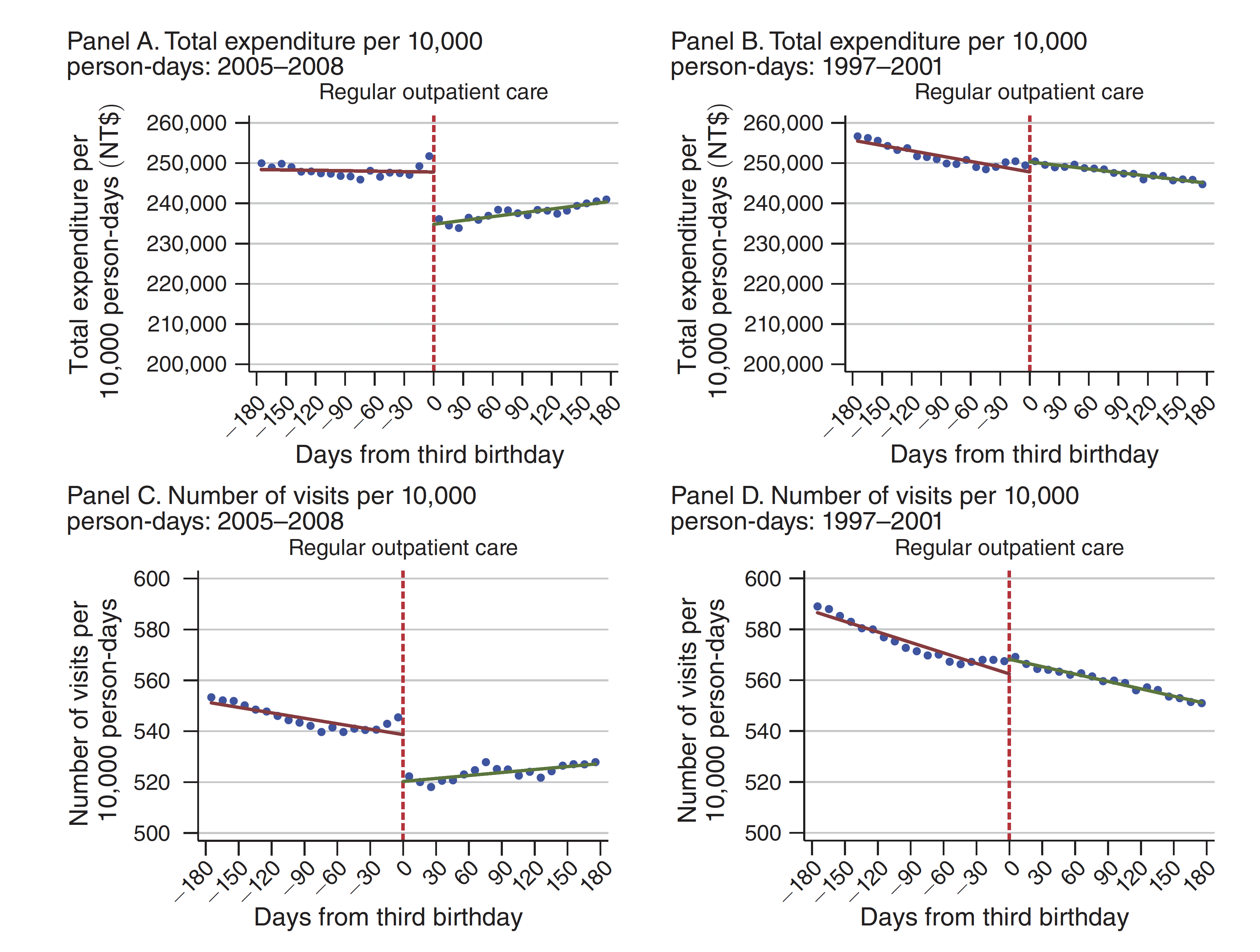 Between 1997 and 2001 (Panels B and D), out-patient spending and visits declined smoothly as children went from age 2 to 3 (indicated by the vertical dashed red line).