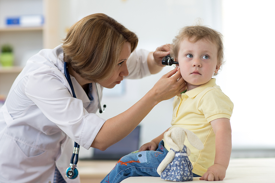 A pediatrician examines a child's ears in a doctor's office.
