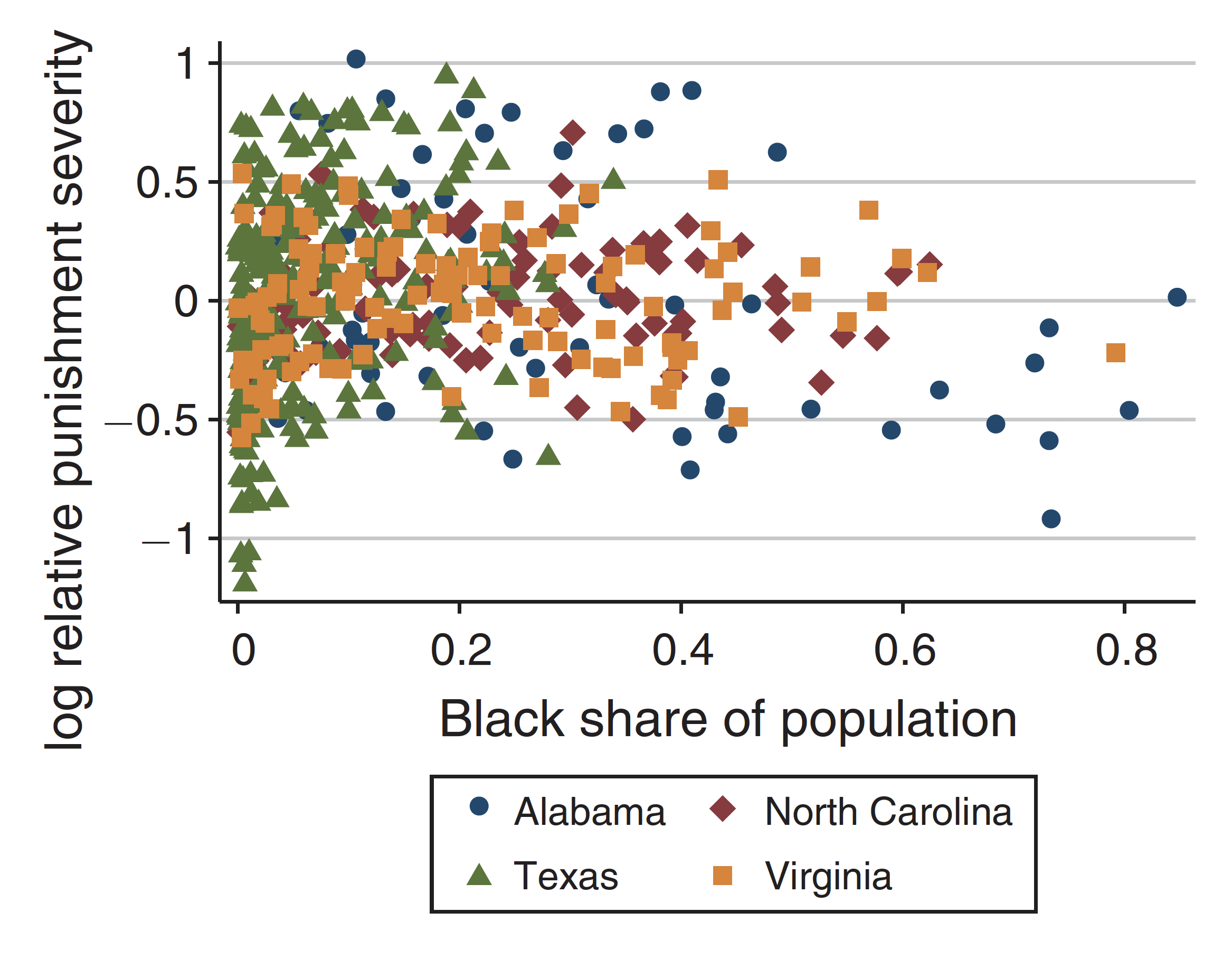 The y-axis (relative punishment severity) captures how much more likely it is that charges in a county lead to a prison sentence—what the authors call predicted confinement rate—compared to other counties in the same state.