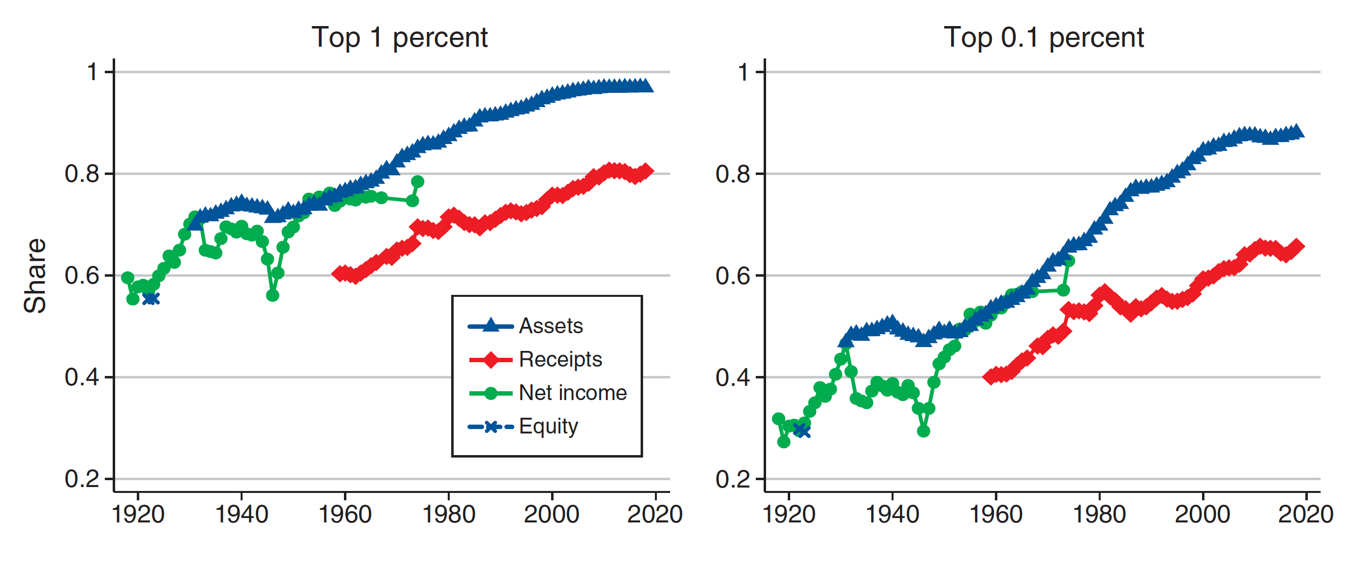 Both series indicate a steady upward trend in top shares. In particular, the share of assets held by the top 1 percent increased by 27 percentage points between 1931 and 2018, reaching a total share of 97 percent. The share of assets held by the top 0.1 percent rose even more rapidly over the period. Measured by sales, the top 1 percent’s share rose by 20 percentage points between 1959 and 2018 and was closely tracked by the top 0.1 percent.