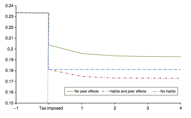The tax had the largest impact on drinking when factoring in habit formation and peer effects together, with that model predicting a decrease in the share of heavy drinkers by 6 percentage points — from 23.5 percent to 17.2 percent — over five years.