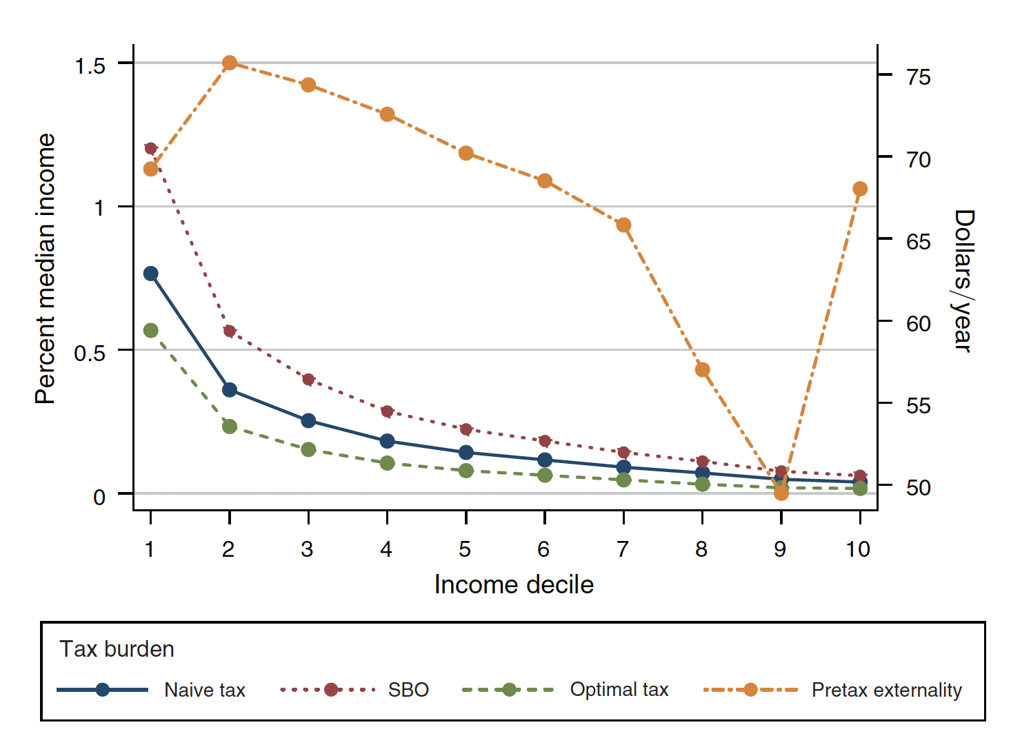 The burden is higher for poorer households — not just because they are poor, but also because their vehicles tend to emit more pollution. The yellow line in the figure represents the dollar value of environmental damages, per household, from vehicle emissions (right axis).