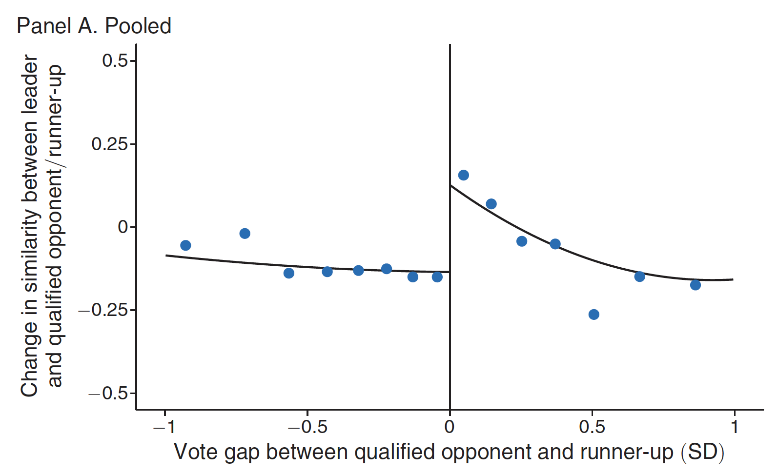 The chart shows a sharp jump at the threshold where candidates qualify for the final round in an election. When the running variable on the x-axis crosses from negative (runner-up) to positive (qualified opponent), there's a distinct convergence between electoral platforms, demonstrating that leaders systematically adjust more toward opponents who qualified than toward those who narrowly missed the cut.