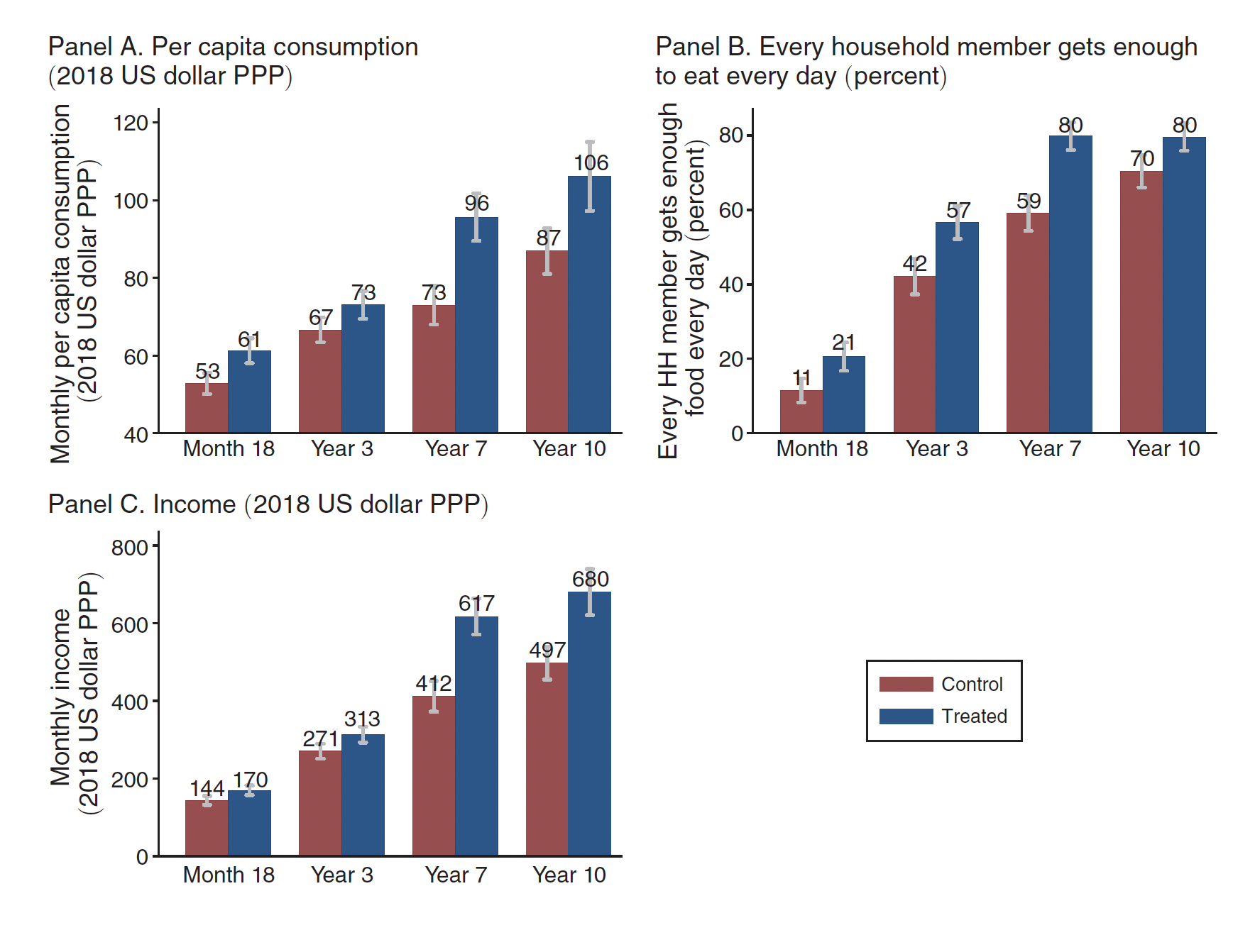 Panel A shows that individuals in treated groups (blue bars) were consuming significantly more than their counterparts in control groups (red bars) eighteen months after the start of the program. That gap continued to widen and by year ten reached a difference of sixty-three cents per day—which was enough to lift the treatment group just beyond the World Bank threshold for “moderate poverty.”