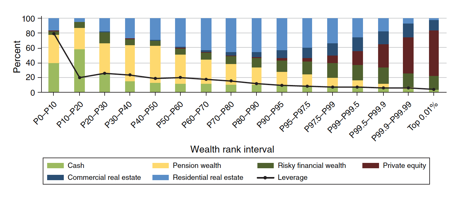 Figure 2 from their paper shows the average allocation of gross wealth, broken down in different brackets of net worth. Cash is dominant for households in the bottom 20 percent of the wealth distribution. Cash becomes less important as net worth grows and is just 3 percent for the richest 0.01 percent of households. Meanwhile, private equity takes over a dominant role the richer someone becomes. Private equity is negligible in lower and middle-income brackets, but blows up to 62 percent for the top 0.01 percent. The share of risky assets—defined as the weight of risky financial assets, commercial real estate, and private equity in household gross wealth— fluctuates around 10 percent for the households in the bottom 70 percent of net worth. Meanwhile, it’s nearly everything—95 percent—for the richest 0.01 percent.