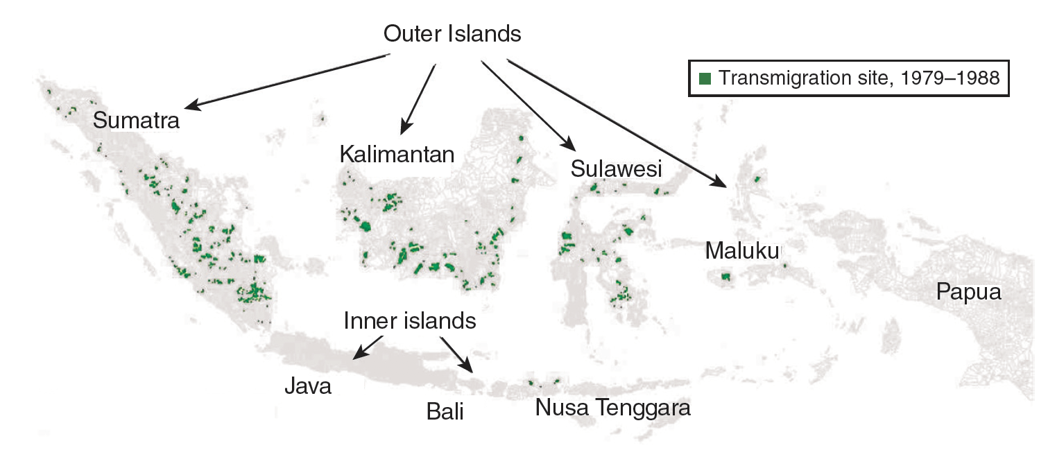 The map below shows the sites of Indonesia's Transmigration program, one of the largest resettlement efforts in history