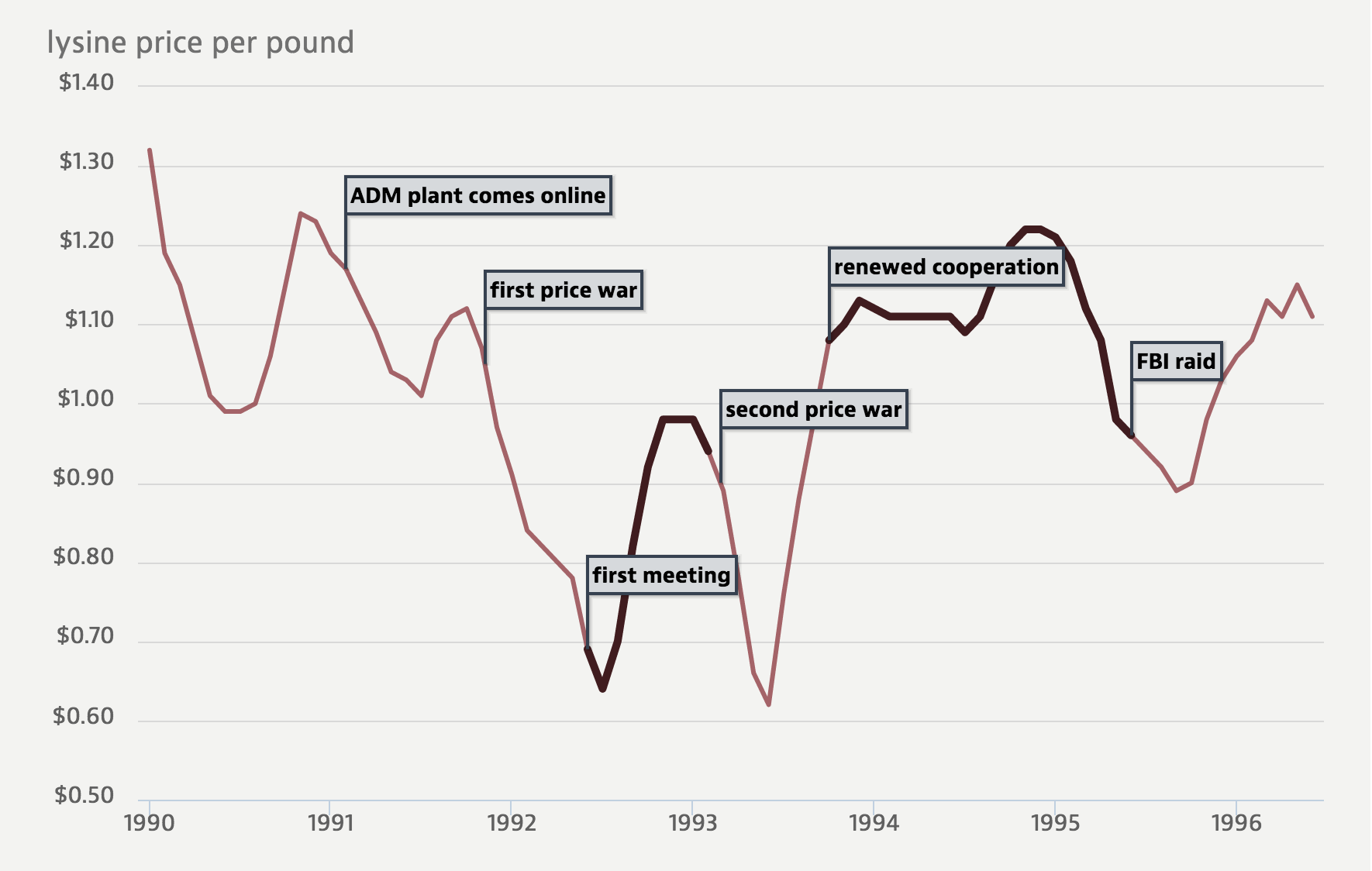 Prices for lysine, an additive in livestock feed, 1990-96. Secret audio and video recordings of meetings between executives from American food conglomerate Archer Daniels Midland and companies from Japan and South Korea revealed ongoing attempts to fix prices in this market. Prices recorded during the approximate period of the conspiracy are highlighted. See source for more details on the timeline of the cartel as it has been reconstructed from court records.