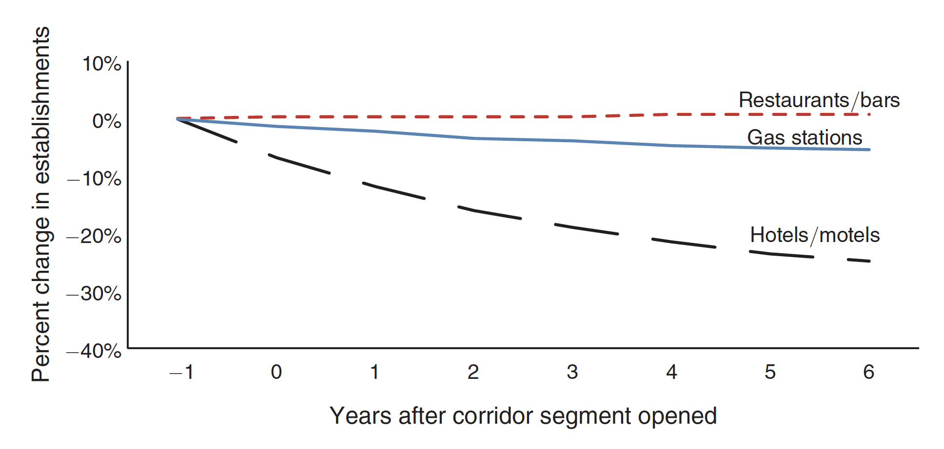 Many of these hotel markets were drastically altered after an opening. The authors estimated that, in affected counties, the number of hotels decreased by about 30 percent, and the size of hotels increased by roughly 30 percent.