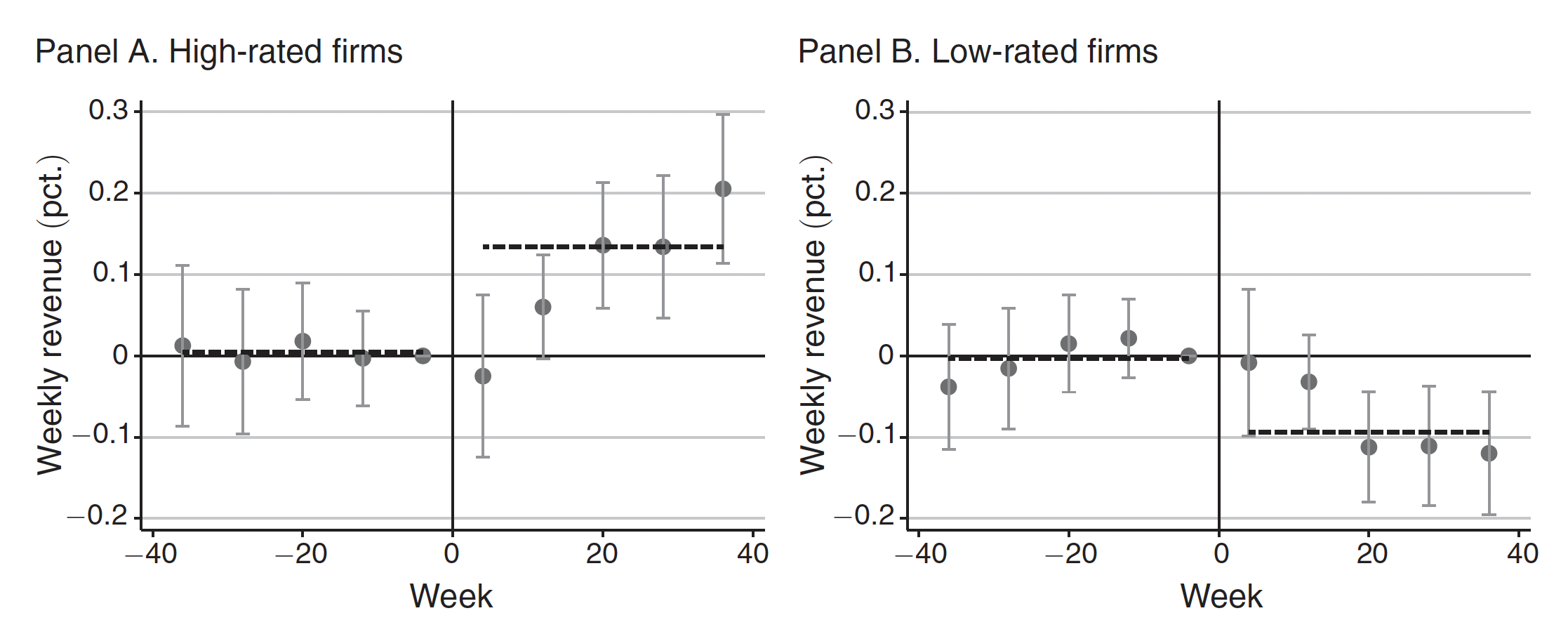 The revenue of the most highly rated businesses in markets that were affected by the partnership increased by up to 15.8 percent compared to high-quality businesses in unaffected markets. The growth in revenue was driven primarily by their ability to attract new customers and retain existing ones. In contrast, low-quality incumbents actually experienced a decrease in their revenue—in some cases, as much as 9.2 percent.
