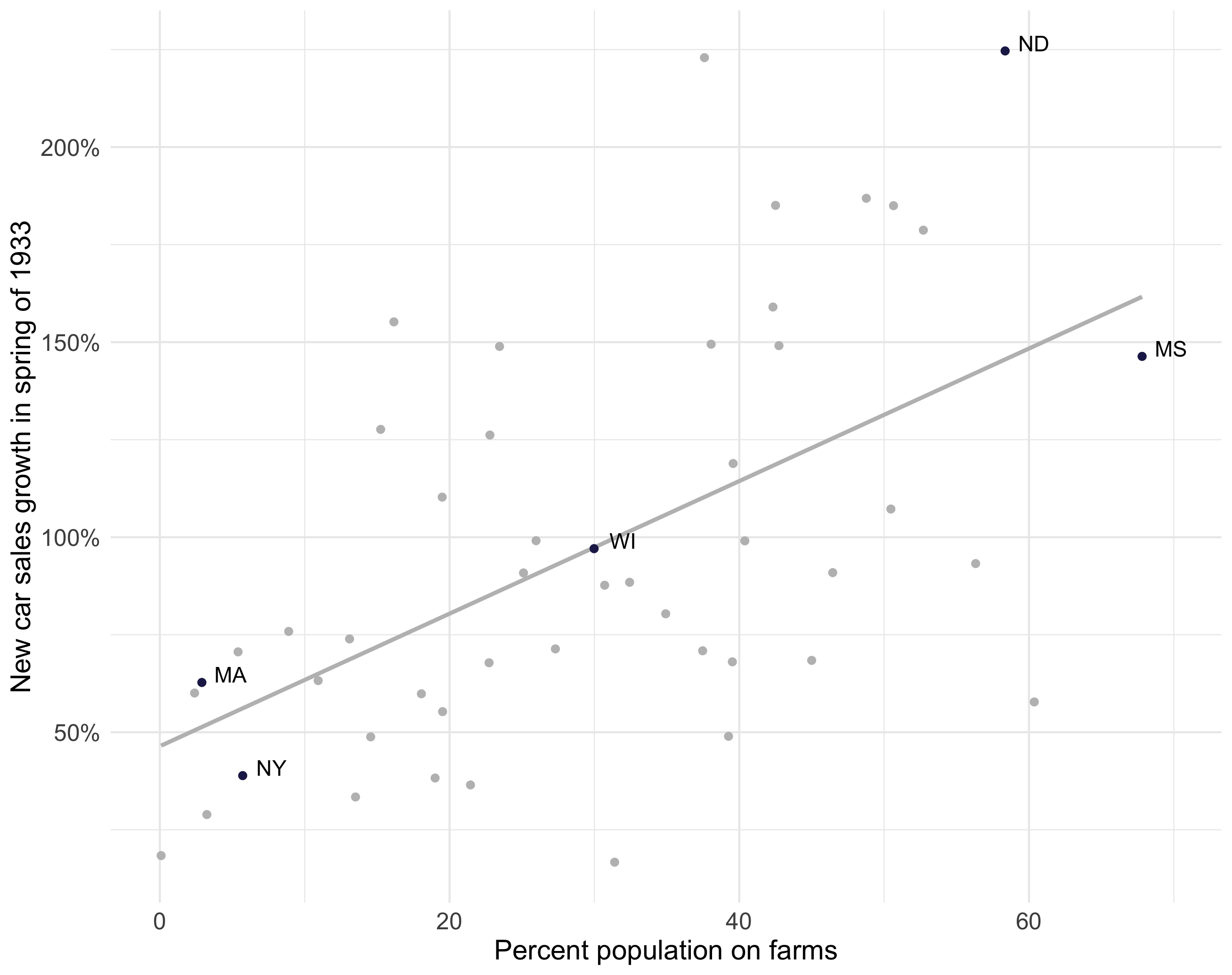 The chart below shows the connection between new-car sales and the share of farmers in each state. States with large cities, such as New York, had lower growth than states like North Dakota and Mississippi, which relied heavily on wheat and cotton respectively. States such as Wisconsin saw relatively moderate growth, partly because its farming was concentrated in non-tradable goods like dairy.