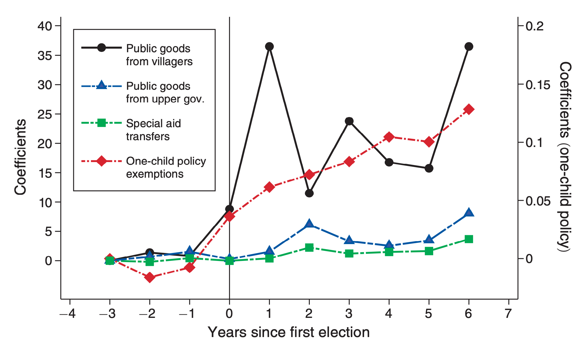 Comparing villages before and after democratic reforms were rolled out revealed that elections improved popular policies and weakened unpopular ones. In particular, local representation increased public goods provision, reduced the amount of village land leased to enterprises, and issued a greater number of exemptions to the widely despised one-child policy.