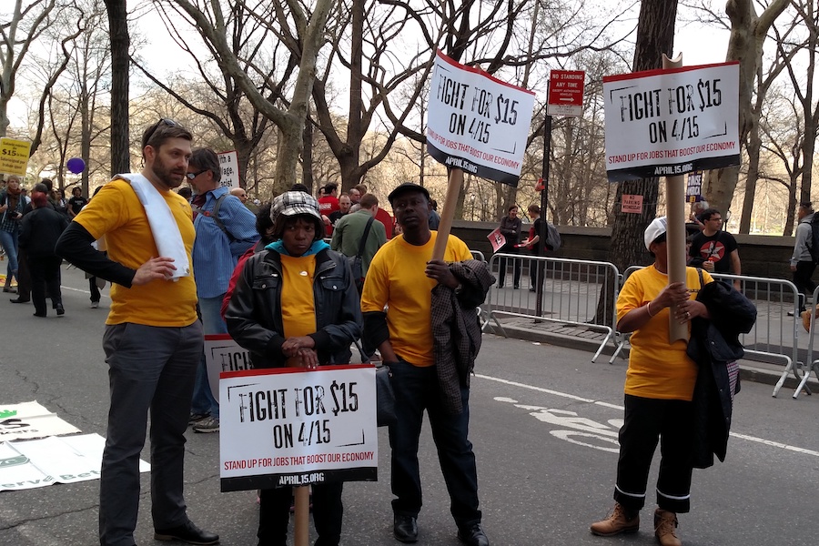 Workers rally in New York City for a $15 minimum wage.