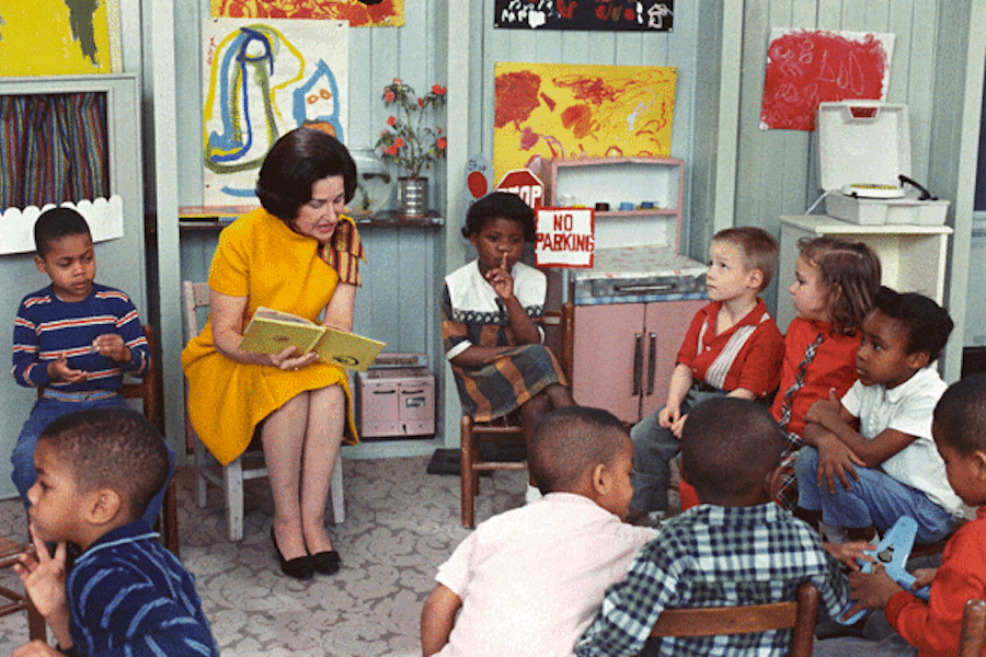 Lady Bird Johnson reads to children enrolled in Project Head Start at Kemper School in Washington, DC.