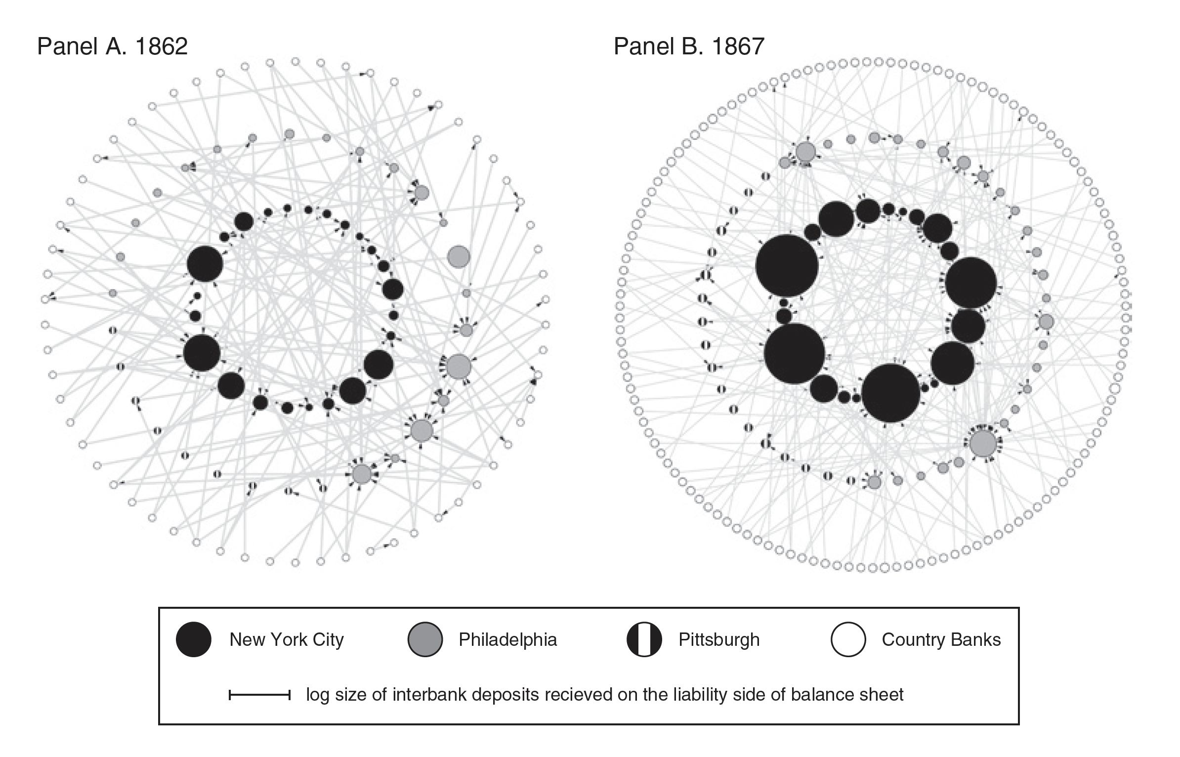 The chart below shows the interbank network in Pennsylvania and New York City before and after the National Banking Acts. Each circle is a bank and its diameter is proportional to the log size of the bank’s deposit liabilities. The direction of the arrow indicates the direction of the deposits. The center-ring contains central-reserve-city banks, the inner-ring reserve-city-banks, and the outer-ring rural banks.