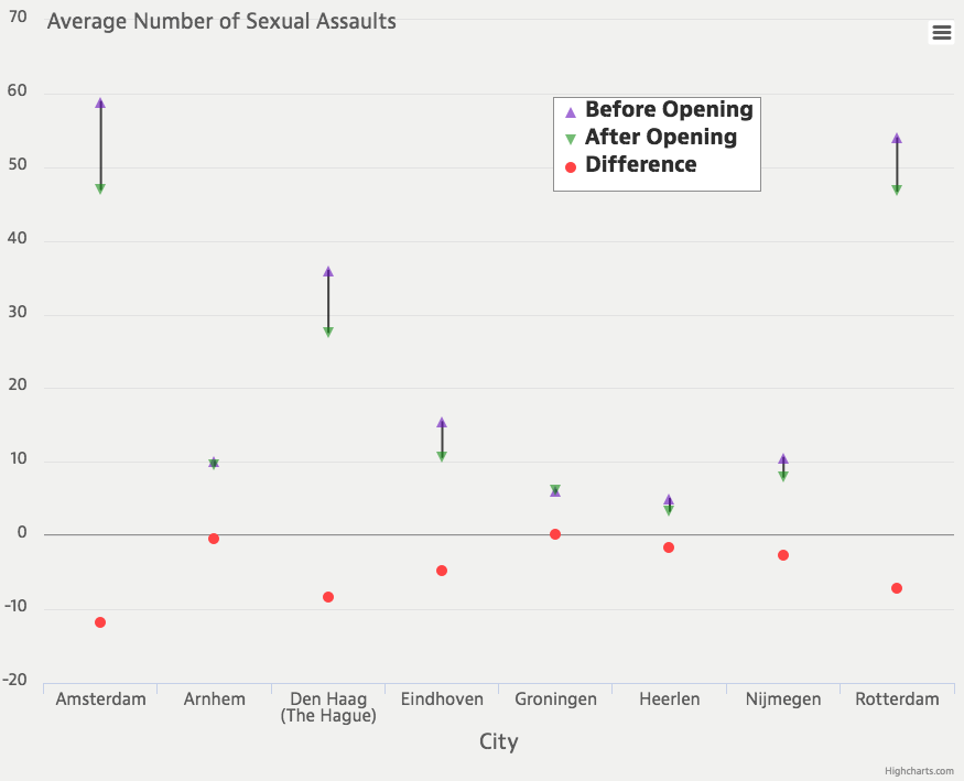 In line with the second theory, the authors found that the zones reduced certain types of crime. In the first two years after opening a tippelzone, cities saw a thirty to forty percent decrease in sexual abuse and rape. There was no effect on violent assaults and possession of illegal weapons, which are not directly connected to the prostitution market.